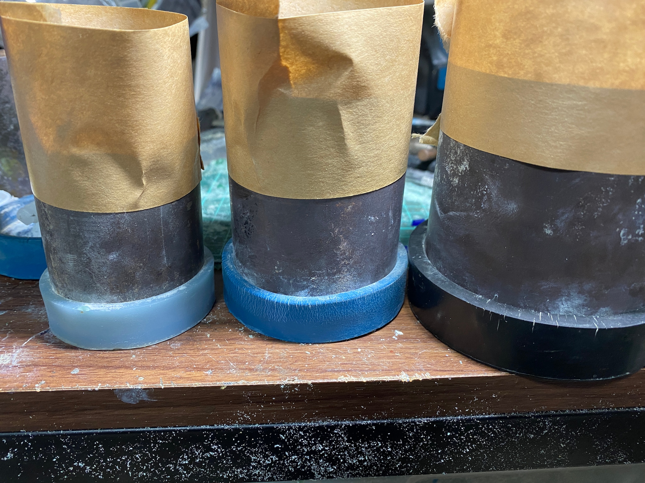 その後、ステンレスの筒をゴムのベースに被せて石膏を流します。石膏に水を加えてかき混ぜる為、石膏には空気が沢山入っています。