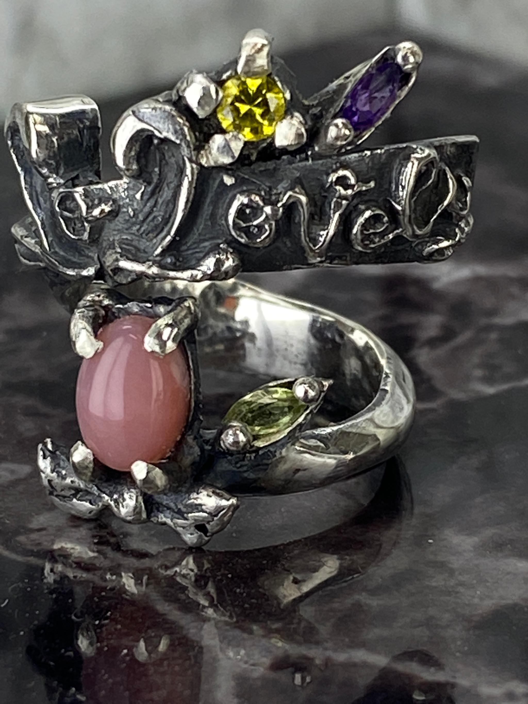 作品展のテーマが「ソロウェディング」という事で花束をモチーフに「So lovely」の文字を入れました。英語で「素敵な〜・・」という意味があり、イタリア語の「一人・独奏」等の意味がある「Solo」と掛けました。