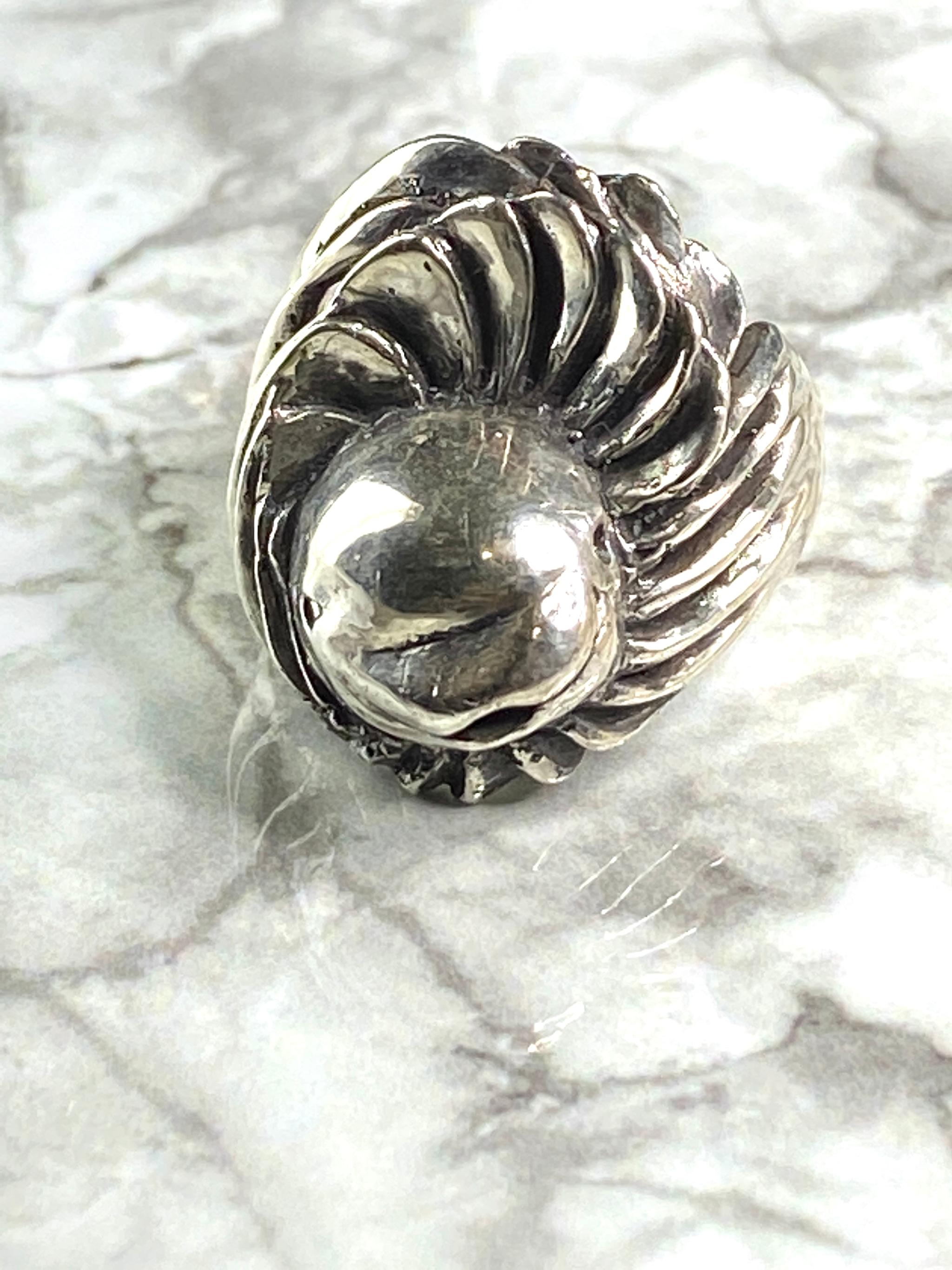 ベルーガリングは、水面から顔を覗かせる姿を表現しました。普通に水面を表現しようとすると燻した際、岩のようなワイルド過ぎる雰囲気になってしまう為、水流をイメージした造形にしました。ベルーガの特徴的な可愛らしい口の造形も拘りポイントです。