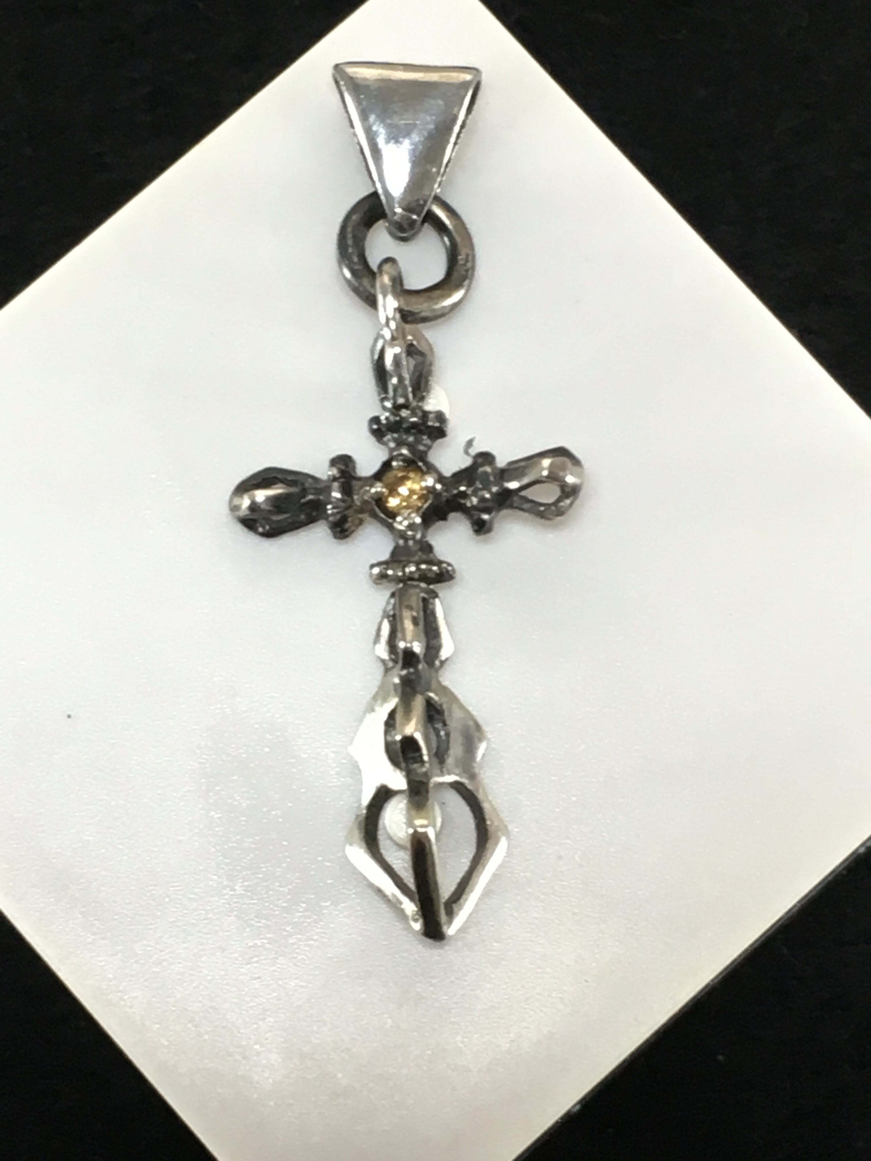 密教法具である金剛杵の一種、三鈷杵をヒントに制作。諸説ありますが「魔を払う武器」のドージェをクロスの形に配置。中央に留めた石はスモーキークォーツラウンドカット2mm、ラピスラズリラウンドカボション2mmを用意しました。