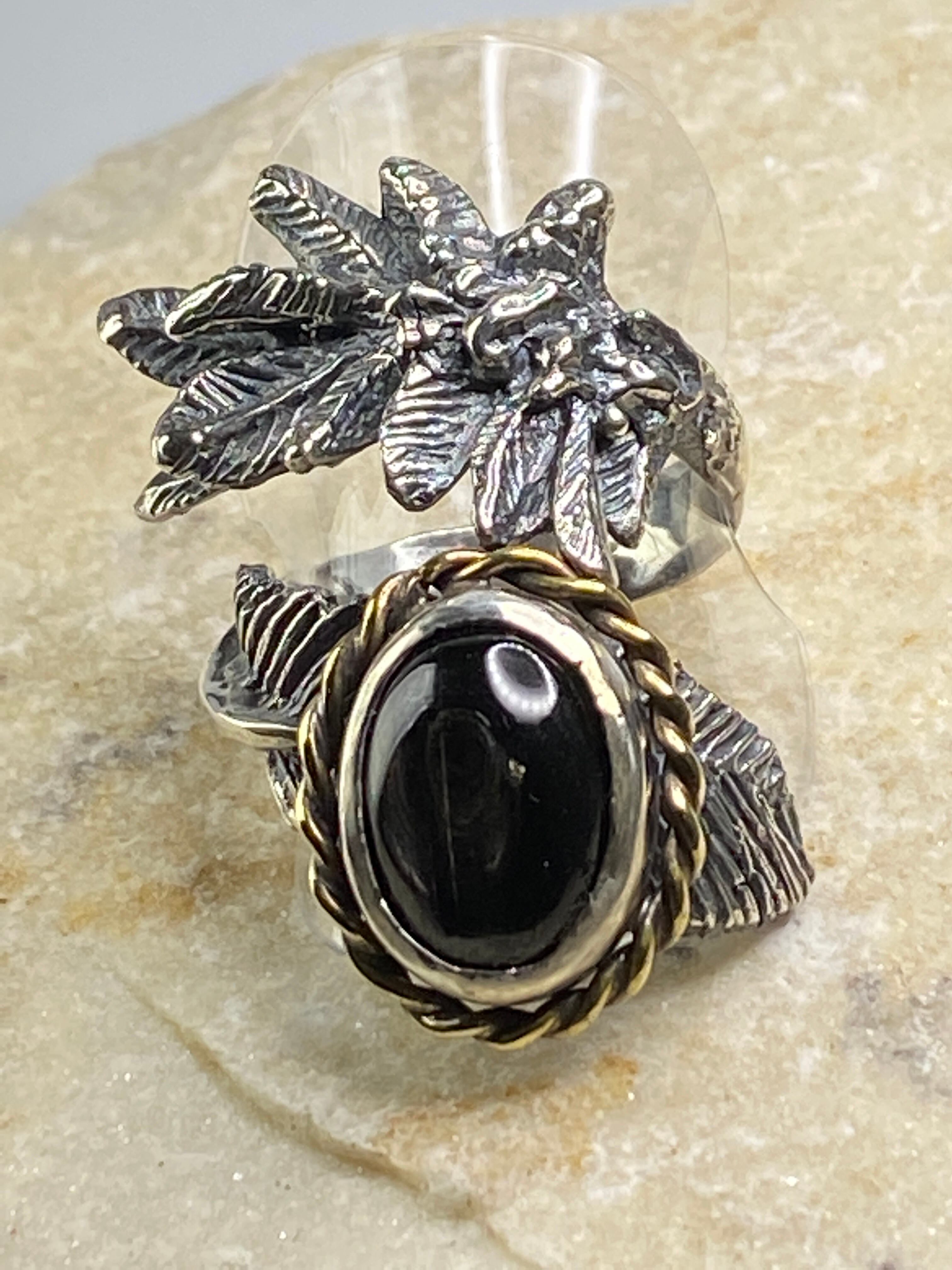 過去作の「owl wing large」とフェザーリングを組み合わせ、更に特徴的な反射光のハイパースシーンを留め、周囲に真鍮の装飾を加えた一点モノのリングです。