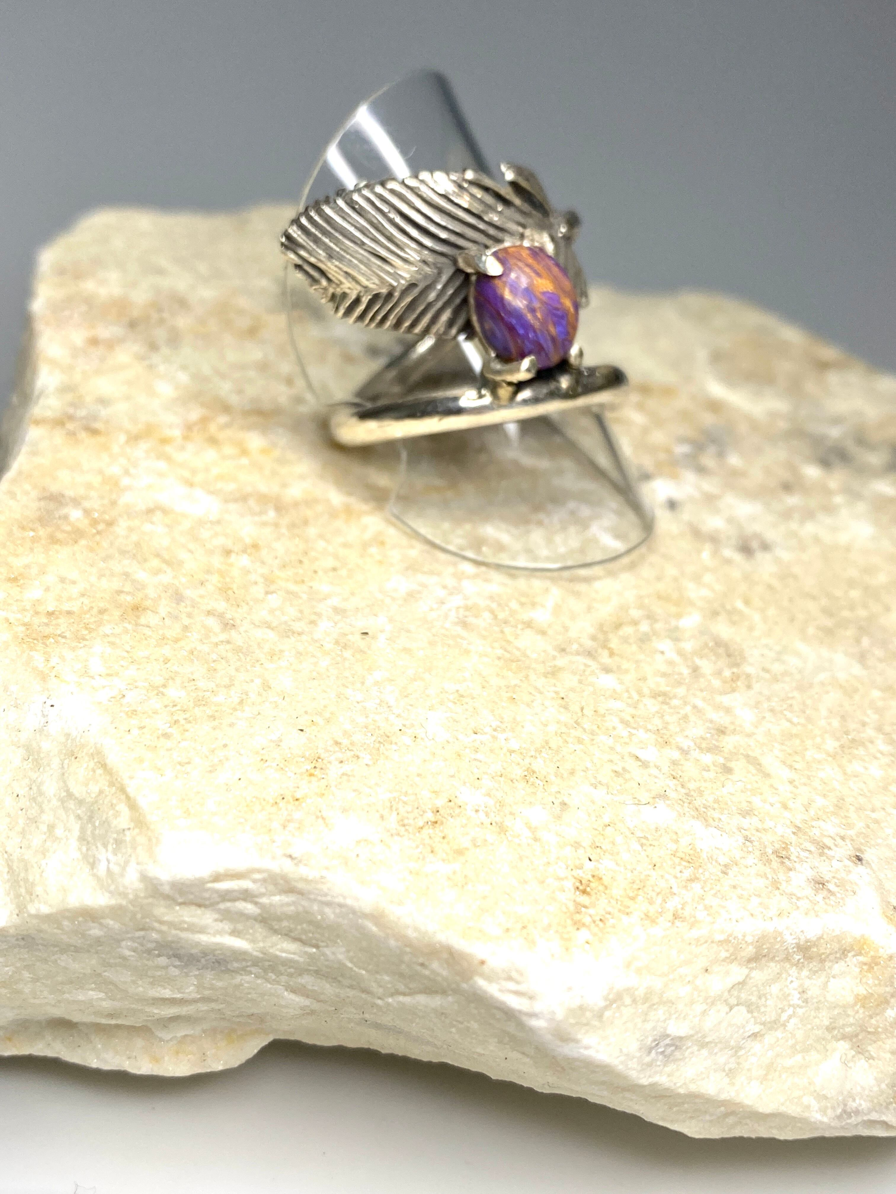 シンプルなフェザーリングに紫と金の色合いが特徴のパープルターコイズを留めた一点モノの作品です。